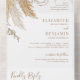 Rustic bohemian wedding all in one invitations featuring watercolor desert dried palm leaves, pampas grass, a modern wedding template, and a tear off perforated meal RSVP postcard. No envelopes needed for shipping, simply fold each card into the outlined shape, and then seal and send, its that easy!