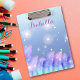 Add a touch of whimsical magic to your daily tasks with this dreamy, personalized clipboard. The design features a stunning array of soft, watercolor-style feathers at the bottom in shades of lavender, pastel pink, and teal. These ethereal feathers are set against a calming gradient background that fades from light blue to soft purple, accented by faux magical sparkles, glowing stars, and a bokeh light effect.