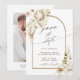 This wedding save the date invitation features painted watercolor protea, white orchids, dry pampas grass, white anthuriums, wildflowers, exotic leaves with an arch frame and a photo on the back. For more advanced customization of this design, please click the "Customize further" link. Matching items are also available.