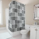 This shower curtain has a Boho design of squares with patterns in each in black and white.