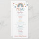 This is a boho rainbow themed baby shower menu. The design consists of a boho rainbow theme with yellow, blue, red, pink, and green colors and hearts.
