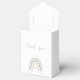 Cute boho baby shower favor box featuring "thank you" in a stylish white script with swashes and a cute abstract watercolor of a sage green, orange and lavender rainbow with hearts. Customize with the mother-to-be's name and shower date.