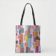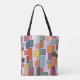 This tote bag has a boho modern design of rectangles attached to vertical lines in various sizes and retro colors.
