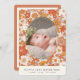 This boho retro girl photo birth announcement card features a cream background with retro & groovy floral pattern in orange and brown. The reverse side features your photos and message. Personalize it for your needs. You can find matching products at my store.