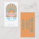 Boho 70's style orange sunrise and mountains business card with retro flourished typography. A 60's and 70's style vibe. Add your name, company, and city. The back of the card is solid orange with blue type. The design pops with the orange and blue complementary colors. Blue type on orange background n the reverse side of the card.