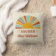 This stylish, personalized throw pillow features a hand drawn boho sunshine in retro shades of terracotta, gold yellow, and aqua. The back contains a matching sunshine illustration. The little star accents can be adjusted, if needed, depending on name length. A textured overlay adds to the retro / vintage look! *Original Illustration by Orabella Prints.