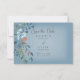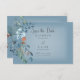 This wedding save the date card design features beautiful blue and burnt orange rust watercolor corner florals on a soft white blur rectangle placed on a dusty blue background. Soft and delicate; perfect for any season. Created by Simply Farmhouse Press.
