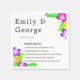 These elegant tropical wedding napkins are perfect for a modern summer wedding. The simple design features bloom yellow, purple, and pink flowers with elegant black typography on a white background.