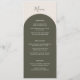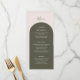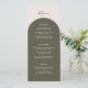 Introduce your reception dining with this elegant bohemian menu card, designed to coordinate with the Sage Green Rustic Arch Wedding Collection while offering a fresh twist on the signature look. The front features a basic dark green arch curve that gracefully frames your meal details, including appetizers, main course selections, and desserts, all set against a soft beige background. Retro design. This subtle variation creates a rich, natural backdrop that lets your menu information take center stage.