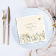 Delicate wildflower meadow garden border with pastel watercolor floral blooms and butterflies elegant chic spring or summer garden boy or girl baby in bloom shower party personalized paper napkins with whimsical simple elegant modern calligraphy script over a cream ivory background.