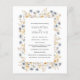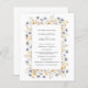 A frame of Rustic pale blue and lilac wildflowers with sage green leaves and yellow and orange accents border your wedding details in a classic gray font. On the reverse side a template to insert the list the members of your wedding party (officiant, parents of bride and groom, maid of honor, best man, bridesmaids, groomsmen, flower girl and ring bearer)