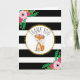 A baby shower thank you card featuring an illustration of a baby fox wearing a flower crown over a black and white striped background with floral designs at top left and bottom right. Matching baby shower invitations at coordinating items are available at Jill's Paperie.