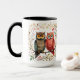 On this unique mug, two owls with boho style patterns perch together on a tree branch. One owl is green and gold; the second owl is red/orange and gold. They are surrounded by gold and green autumn leaves. The image is printed twice on the mug.