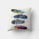This two-sided throw pillow features watercolor illustrations of bird feathers in a boho style in rich, vibrant colors set against a light cream background. There are four feathers on the one side and three on the other.