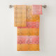 Boho Sunrise Pattern Bath Towel Set. Alternating bright colorful tiles of pink and orange with a rustic overlay seamless pattern in bronze to enhance your home bathroom décor. Towels are a fun, stylish accent accessory to help compliment your color scheme and style of the main, guest, or master bathroom. I would be happy to rescale, tint, or design with you in mind, just message me to get started.