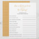 Boho script "How well do you know the Mommy?"" graphic in rustic yellow with line art sun detail, baby shower game sheet with matching rustic yellow pattern backing.