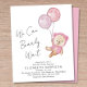 Boho budget-friendly baby girl shower invitation featuring a cute watercolor illustration of a pink teddy bear floating with balloons, and "We Can Bearly Wait" in a handwritten calligraphy script.