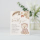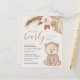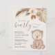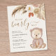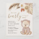 Boho budget-friendly taupe baby shower invitation featuring a watercolor illustration of a cute teddy bear, a bouquet of beige and terracotta pampas grass and florals and "We Can Bearly Wait" in a mix of simple typography and a stylish swash script.