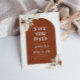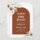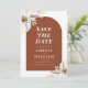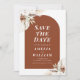 wedding save the date card with rust earthtone terracotta design with flowers and lovely script.