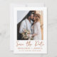 This boho wedding save the date announcement card features two photos and chic terracotta save the date lettered script on a clean white background. The back is one full photo. Let guests know you will be inviting them to your upcoming wedding with this simple minimalist one photo save the date card (classic coordinating wedding invitations can be sent at a later date, and are available to be purchased separately).