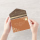 Elegant, boho, modern, simple wood terracotta all-in-one wedding invitation with faux gold floral lace and custom picture of the couple at the back.