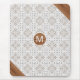 Stylish mousepad for home or office in a gray Bohemian tile pattern print with bamboo corner elements design and mongogram in the center.