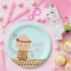 Boho tribal baby shower paper plates with adorable baby boy wearing cute Indian outfit with arrow and dream catcher on a Aztec Indian Native American design background. You can add text to personalize and you can change the background color.