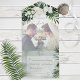 AVAILABLE WITH OR WITHOUT A QR CODE OR DINNER OPTIONS. This design features beautiful, lush tropic greenery and white florals on a soft lush green watercolor background. Personalize it with your own special photo. Perfect for the destination or beach wedding. Created by Simply Farmhouse Press.