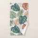This bathroom towel set features a pattern of tropical monstera and palm leaves in subtle autumn shades of green and rust on a beige background.