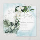 This wedding response card design features beautiful, lush tropic greenery and white florals on a soft Caribbean aqua blue watercolor background. Perfect for the destination or beach wedding. Created by Simply Farmhouse Press.