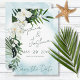This save the date card design features beautiful, lush tropic greenery and white florals on a soft Caribbean aqua blue watercolor background. Perfect for the destination or beach wedding. Created by Simply Farmhouse Press.