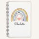 A cute personalized kid's watercolor boho rainbow notebook featuring a pink mustard and blue rainbow with pink heart in the middle and name.