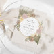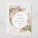This modern wedding save the date invitation has bohemian inspired watercolor features, including rustic pampas grass, orchids, palm leaves, anthurium and protea flowers and a simulated gold frame around the circle. The beige background behind the circle can be changed, or deleted if you want white. The copy is editable and the font can be changed. The card has a colored background, a little darker than the front. You can change the back color.