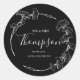 An elegant, round sticker with Black background and white text. Hand drawn botanical wreath with modern japanese ginkgo leaves surrounds the text. Perfect for weddings, thank you cards and many more!