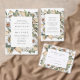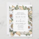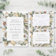 Elegant, unique white floral wedding invitation featuring your wedding details framed by white watercolor flowers and lush foliage in rich green, beige, and brown earth tones. The invite reverses to a light beige watercolor background.