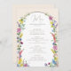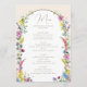 An arch decorated with whimsical colorful watercolor wildflowers frames the meal options on these boho floral wedding menu cards. Please check out the collection for the matching wedding invitation suite and more matching products.