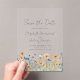 This rustic boho design features a watercolor border of orange and blue wildflowers along the bottom. The words "Save the Date" and the couple's names appear in stylish charcoal gray handwriting script, with the remaining text in sans serif font on a clear background.
