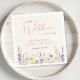 Elegant light cream baby girl shower napkins featuring "a little wildflower is on her way" written in a blend of grey typography and a stylish pink script, and boho-inspired whimsical watercolors of dainty purple, pink and yellow wildflowers. Add the name of the mother-to-be in simple pink lettering.