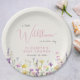 Elegant light cream baby girl shower paper plates with "a little wildflower is on her way" showcased in a blend of grey typography and a stylish pink script, and boho-inspired whimsical watercolors of dainty purple, pink and yellow wildflowers. Add the name of the mother-to-be in simple pink lettering.