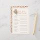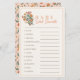 This boho & retro "baby word scramble" baby shower game card features a cream background with a retro wildflower bouquet in pink, and orange. The reverse side features a cream background with wildflower patterns. Personalize for your needs. You can find more matching products at my store. Answers : 1. DIAPER 2. PACIFIER 3. STROLLER 4. STUFFED ANIMAL 5. BODYSUIT 6. TEDDY BEAR 7. RATTLE 8. NURSERY 9. BOTTLE 10. FORMULA 11. MILK 12. CRADLE