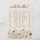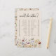 This stylish & elegant bridal shower 'would she rather' game features gorgeous hand-painted watercolor wildflowers arranged as a lovely frame and elegant calligraphy script. The back includes a lovely coordinating pattern. Find matching items in the Boho Wildflower Bridal Shower Collection.