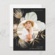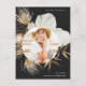 This whimsical botanical graduation party invitation features a modern boho wreath with circular photo on a black background, and graduation party details with return address on the back.