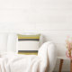 Retro boho throw pillow features horizontal stripes in yellow gold, brown, and green in various sizes on a creamy white background. Decorate your cozy modern living space, bedroom, porch, or patio with this colorful throw pillow. Perfect for both indoor or outdoor living.