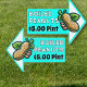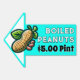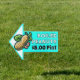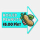 Roadside sign for boiled peanuts. Brightly colored, arrow-shaped sign with text templates on both sides. Bright turquoise blue color with bold white text for product name. Bold black text for price or other information. A peanut image is printed over white in the arrow tip area. The same text will print on both sides. Purchase with the sign stand, or not.