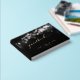 An elegant and sophisticated black and gold wedding guestbook featuring black with shimmering white bokeh lights in the background with gold foil swash calligraphy with your names on the front, spine and back covers in a modern san serif font. The book reads, "guest book,' on the front and wedding on the back in a swash font script with your names and date.