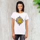 The vibrant yellow and black design pops against the crisp white background, ensuring that you stand out in any crowd. The fitted silhouette of the shirt complements the feminine figure, making it a flattering choice for all body types. It's the perfect blend of comfort and style, making it suitable for everything from casual outings to weekend adventures.