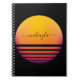 A notebook personalized with your name and featuring a stylized sun in shades of orange and purple, on a black background.