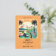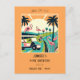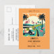 A bold and colorful art-deco-style 50th birthday party invitation in vibrant orange, green, and cream with pink flamingos, a golf cart, and palm trees. Use this postcard to celebrate your friend's, wife's, co-worker's, partner's, etc. 50th birthday with a game of golf followed by celebratory drinks and dinner. Hopefully, the birthday gal will be able to score a hole-in-one!
