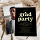 Stylish graduation party invites featuring "grad party" displayed in bold gold foil lettering with the graduate's name and party details shown below on a black background. The back of the black and gold graduation party invite features the graduate's vertical photo. The simple graduation party invites are perfect for both high school and college graduates.