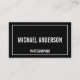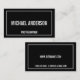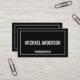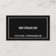 Bold Black and White Business Card featuring information in white bold sans serif font style with white border on black background.
